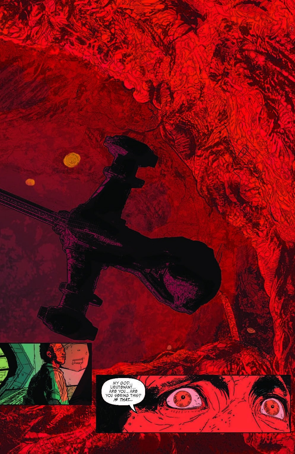 Written by Christian Ward, Event Horizon: Dark Descent #2 focuses on the maiden voyage of the ship and what happened to it and its crew before the events of the film. With the drive activated, they have found themselves in hell surrounded by cosmic horrors and their own horror within. Quickly the crew succumbs to it all and that could be the only gripe of the comic. Yes, we know that something terrible happened, but there’s little tense build up to all of that and the second issue dives right into much of the crew being driven mad. It’s not a build up of visions or haunted by ghosts of their pasts, it’s just straight up madness at times resulting in their self harming with a popular one being gouging out their eyes. It’s quick to get to gore.