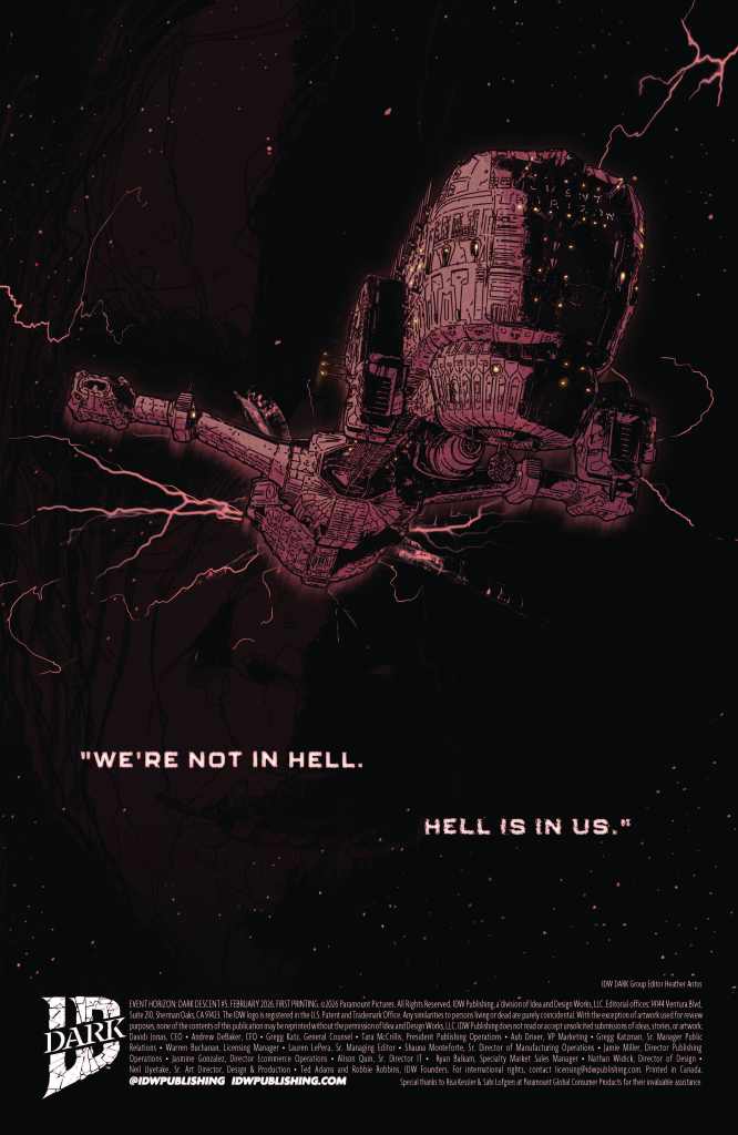 There are a few films that have trouble watching. When there’s extreme gore and body horror, I tend to wince and often struggle to get through it. Hellraiser and Event Horizon are two that I’ve watched and dread watching again. So, I went into the first issue of Event Horizon: Dark Descent with a slight PTSD of the film and slight tenseness knowing my experiences from watching the movie. I was able to make it through the comic, though with unease. Event Horizon: Dark Descent #2 continues that unease as to crew is plunged into hell and are confronted by the demons within.