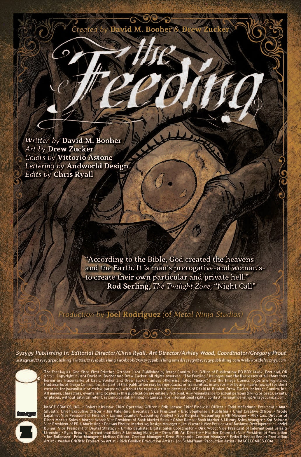 Eisner and GLAAD Award-nominated writer David M. Booher and fan-favorite artist Drew Zucker, the team behind hit fantasy comic book series Canto, are teaming up again for the new horror one-shot comic book The Feeding from Syzygy Publishing and Image Comics. Debuting this October, the oversized comic is a throwback to self-contained horror and sci-fi stories in the vein of Tales from the Crypt, Creepshow, and The Twilight Zone.