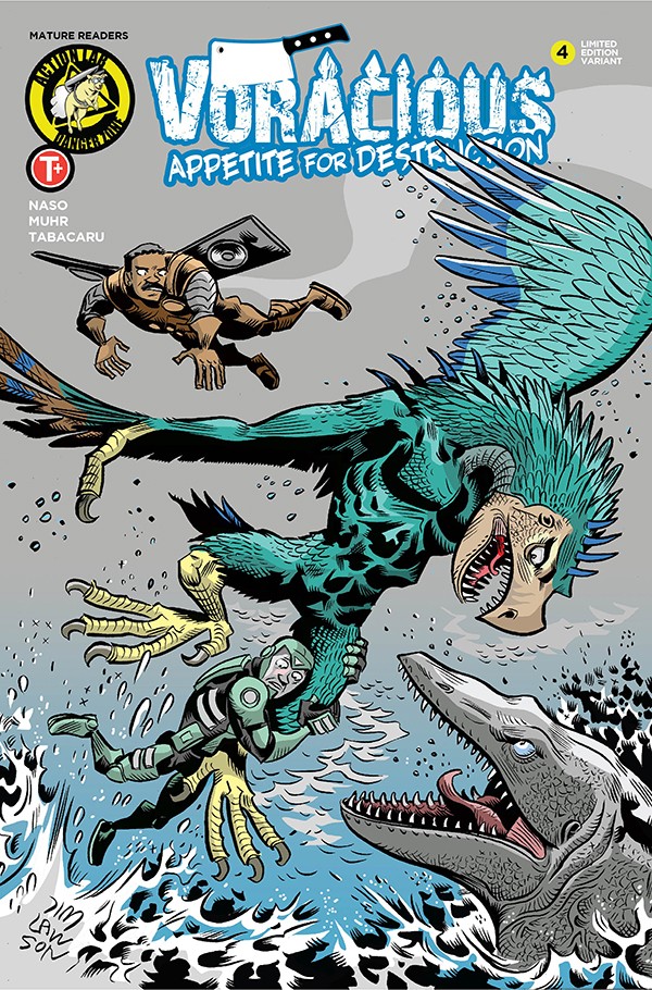 Voracious: Appetite For Destruction #3 allows readers to take a bit of a breather from the hunt for a giant dinosaur bird monster that Owen has become that was the focus of the first two issues, and allows the readers and story to breath before the next confrontation. Naso demonstrates a grasp of pacing and plot development that some have either inexplicably forgotten or never knew about. It’s this kind of mid series breather that allows the writer to double down on the action over the remaining chapters, as hints he’s dropped as seed up to ten issues ago are beginning to flourish into full blown oak trees of awesome.