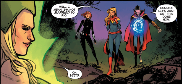 The big problem with Captain Marvel #6 is that much of the action is said to take place in Rio de Janeiro and Sao Paulo, Brazil, which have metropolitan areas of over 12 million each, but 90% of the comic happens in a fucking jungle. Thompson’s writing is clever, and she nails the dysfunctional personalities of Dr. Strange and Captain Marvel. But, at the bare minimum, she could have read Wikipedia and realized that Brazil is 87.5% urbanized. Despite this huge research faux pas, Captain Marvel is an enjoyable read that doesn’t take itself too seriously, has hilarious faces and well-done action choreography from Martello and Bonvillain, and has an Overall Verdict of Read.