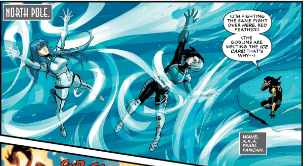 In New Agents of Atlas#4, this new pan-Asian superhero team finally gets their act together to assemble and prevent Sindr, the Fire Goblin queen from melting the polar ice caps. Greg Pak and artists Gang Hyuk Lim, Moy R, and Pop Mhan take their cues from third act of the 2012 Avengers film from Jimmy Woo playing the Nick Fury role and lying about Pele’s true nature to get the team to work together and lots of big epic splash pages of heroes doing team-up moves. However, with the exception of Brawn, Shang Chi, and the Filipina heroine Wave, I feel like I barely know these heroes so the big fight scenes look pretty, but feel like action figures in position, not characters reaching the end of their journey.