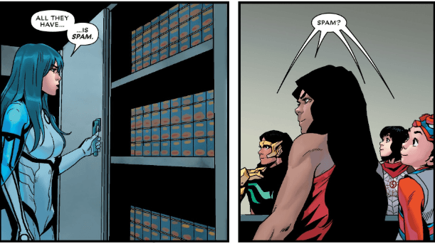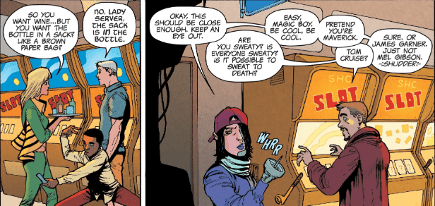 However, the two tie-ins that take the cake in the comedy department and are also fun road stories are The McElroys and Andre Araujo‘s Journey into Mystery and the aforementioned Unbeatable Squirrel Girl. Most of the humor in Journey into Mystery comes from character idiosyncrasies, like Miles Morales not knowing what to do in a casino because he’s never left Brooklyn or Death Locket’s obsession with Westerns because those were the only movies her Life Model Decoy “uncle” had programmed. The jokes also come out of the wacky situations that the ensemble cast finds them in from a Skrull trailer park to a literal Western ghost town and a henchman convention.