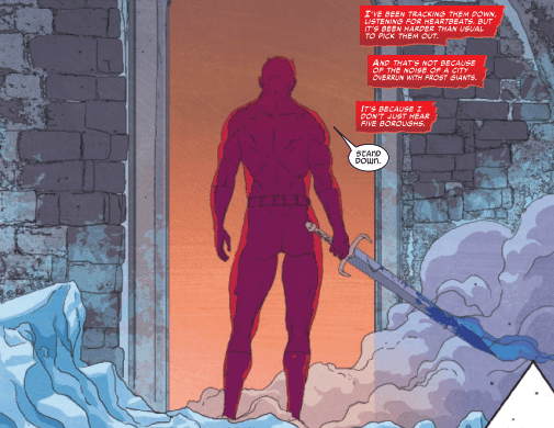 Matthew Wilson really is the secret weapon throughout the “War of the Realms” event with his work on the core miniseries as well as issues of Thor and the Daredevil serial in War Scrolls. His colors are the ingredient that put the Frost in Frost Giants, the Fire in Fire Goblins, and the effects he uses in War of the Realms #6 make the storm caused by the four Thors truly cataclysmic. But his work isn’t all chaos and Kirby krackle, and there’s delightful minimalism to the big scenes like the reforging of Mjolnir or Daredevil gazing from above that cause one’s eye to linger on the panel and reread the issues that he has colored and that Russell Dauterman has drawn again.
