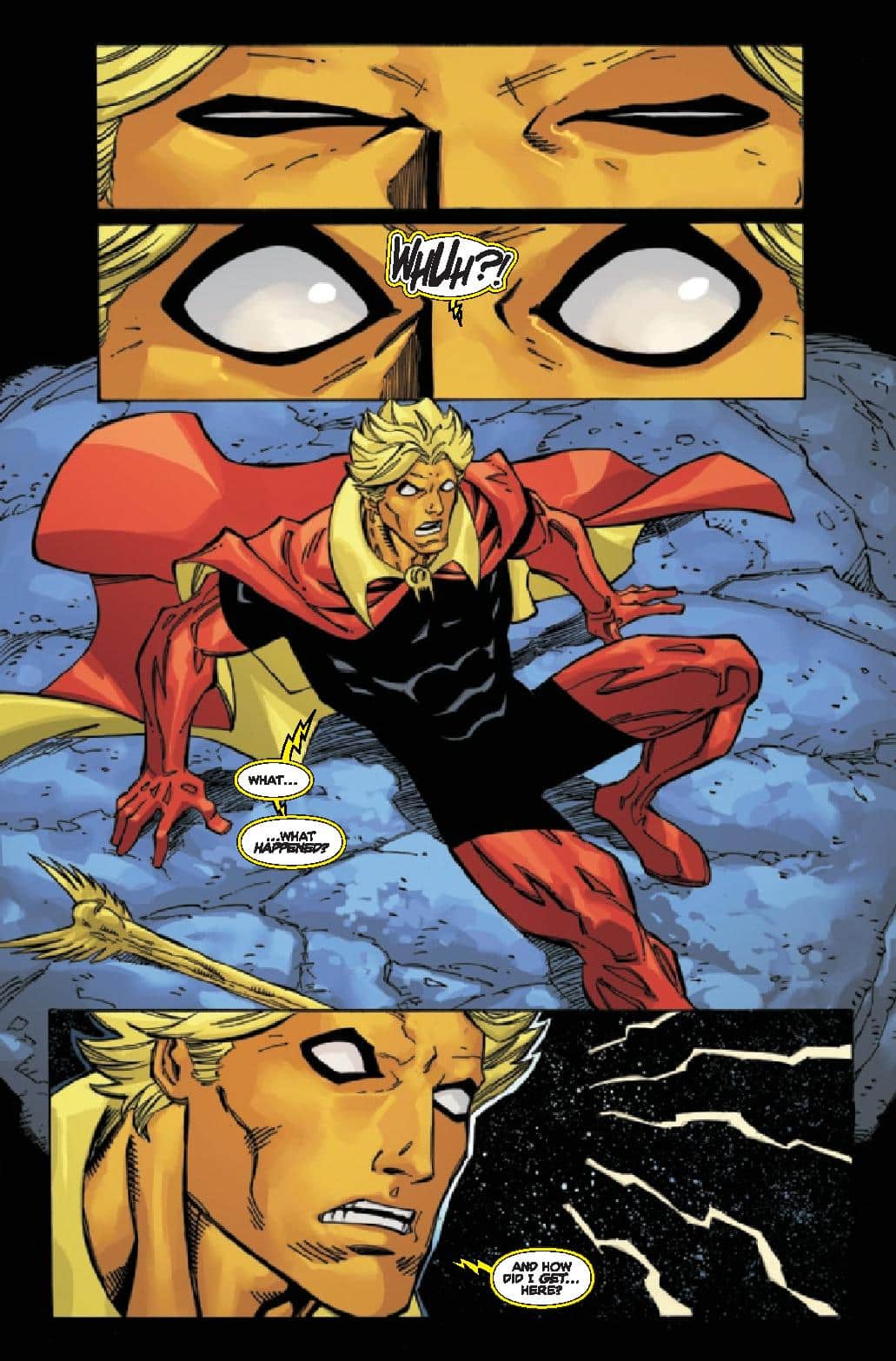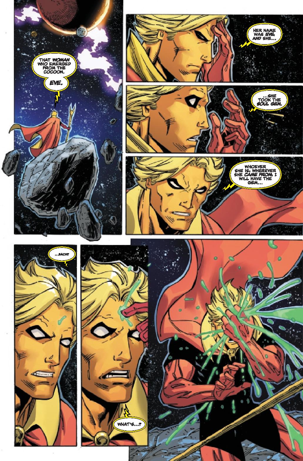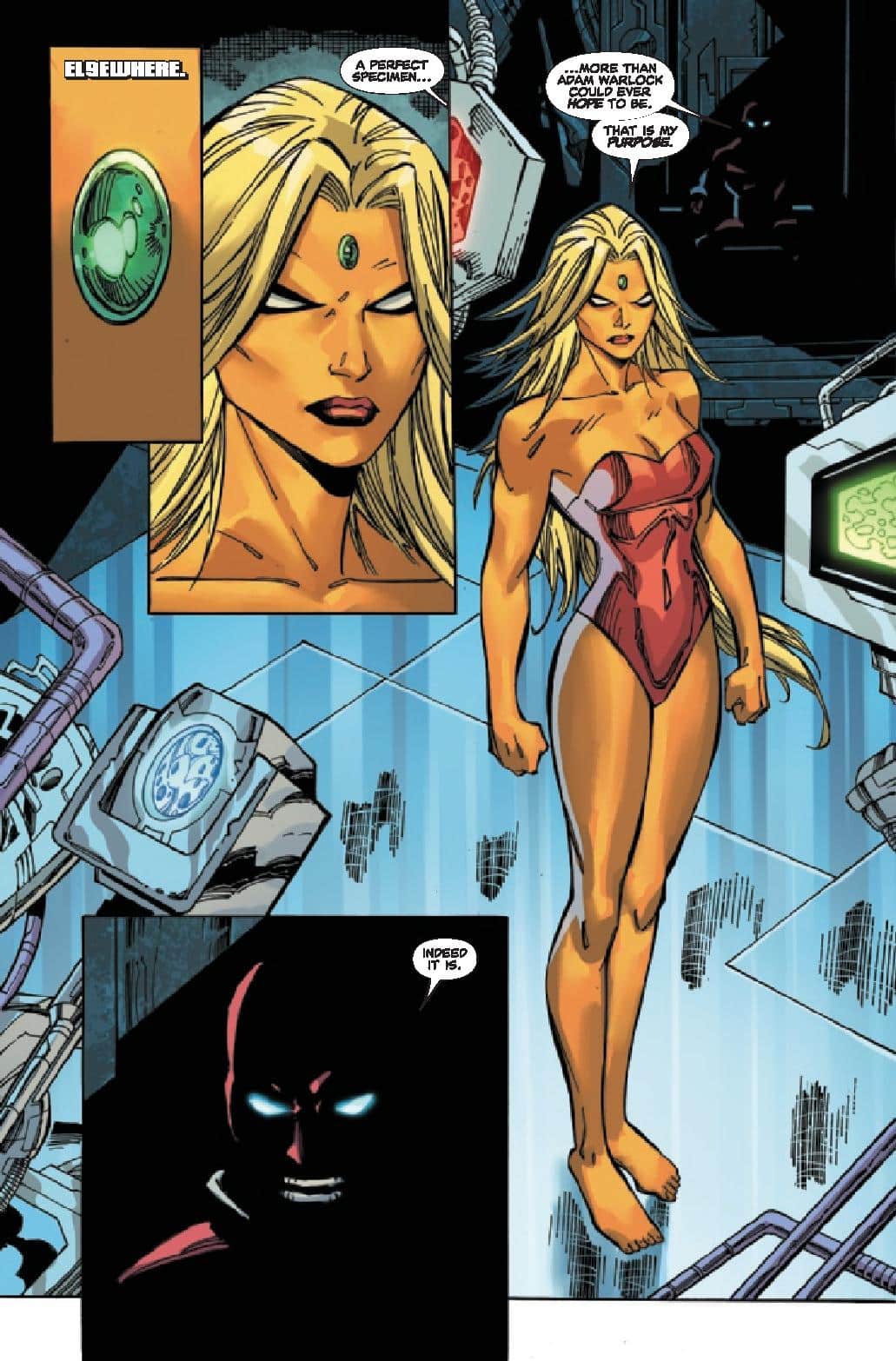 We are taken to Monster Isle, where we find Genis-Vell, Captain Marvel’s son, looking for any remnants of his father’s past there. We find out after Adam was weaponized, he returned to Earth to live life as a man, as some of his team takes Genis-Vell to Adam, we find him in a state of disarray. As something strange appeared, draining him of his energy. This strange object starts to call his name, and what emerges, is a carbon copy of himself, bur female, it is Eve Warlock. By issue’s end, we find out she is there to replace him and will stop anyone in her way.