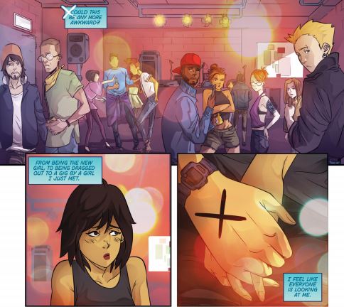 We Are the Danger #1 is just a slice of life teen band book, but Lelay’s art and especially Aguirre’s colors make it look magical. Any time music is being played, whether at a quick acoustic jam session at Jules’ place or the gig that opens up the comic, Aguirre uses vivid background colors, and Lelay draws closed eyed close-up of the characters to show how much music means to them. Or there’s a giant mosh pit that allows for manga-esque pratfalls like Jules basically swooning for Tabitha’s bishonen (She finds out about this later.) brother. There’s an air of wonder to everything seen through Jules’ eyes, and her friendship with Tabitha is easy. Maybe, a little too easy, and the origin of the interpersonal conflict between Logan and Tabitha is definitely a subplot to pay attention to going forward.