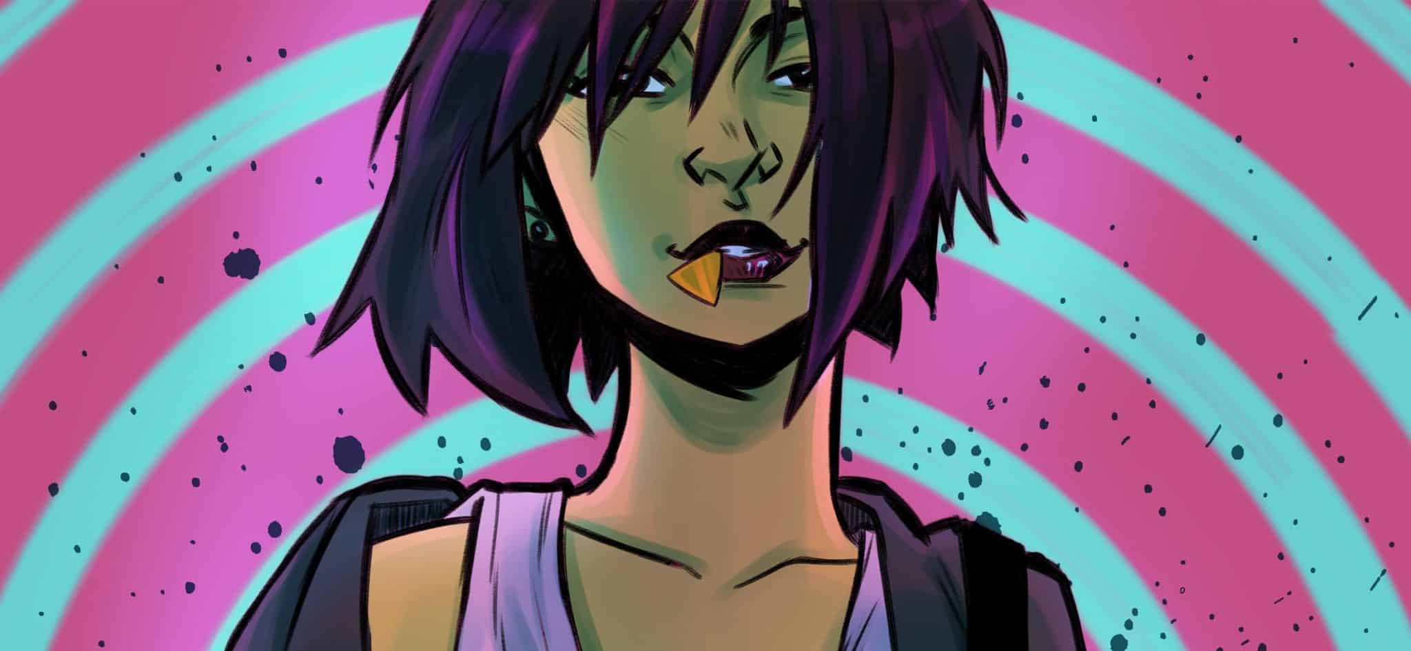 In their new series We Are the Danger, writer/artist Fabian Lelay and colorist Claudia Aguirre channel teenage angst and uncertainty into pop rock magic. Jules is the new girl in town and having the usual issues making friends and finding her niche that all people who have moved from place to place can relate to. But, then, she gets invited to a gig by a super cool, pink haired drummer named Tabitha, and the rest is pretty thrilling from there. Lelay’s candid captions and hyper-expresssive art, Aguirre’s power pop color palette, and Taylor Esposito’s livewire letters recapture a time when meeting a new, cool friend could open a world of potential to you whether that’s learning about a new band, going to a gig, or best of all, starting your own.