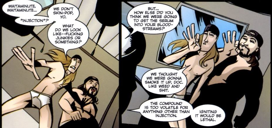 In issue #1 of the comic, Jay and Silent Bob are put through a gauntlet of potential origin stories that are taken straight out of Marvel and DC Comics. They range from Jay ignoring the ring of a dead Green Lantern to Jay killing a radioactive spider that was on its way to give Silent Bob powers that required some kind of responsibility, or whatever. After going through a few of them, they land on a drug trial for the creation of super soldiers. Here’s where stuff gets interesting.