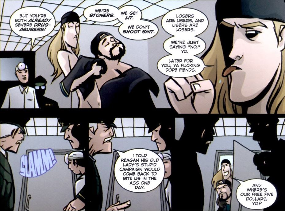 It is at this moment that Jay makes one of the most important statements in comic book history, perhaps in all of fiction. “We’re stoners. We get lit. We don’t shoot shit. Losers are users, and users are losers. We’re just saying ‘no,’ yo. Later for you, ya fucking dope fiends.”