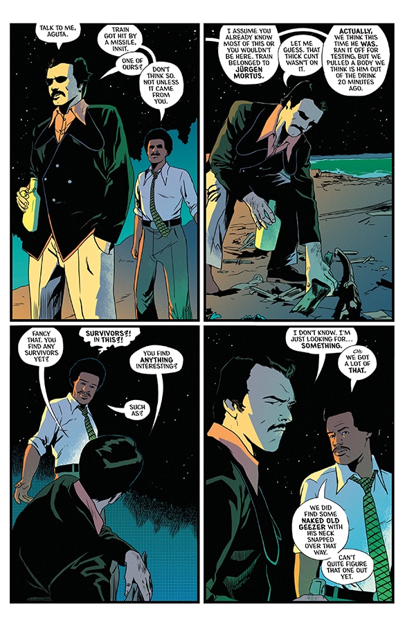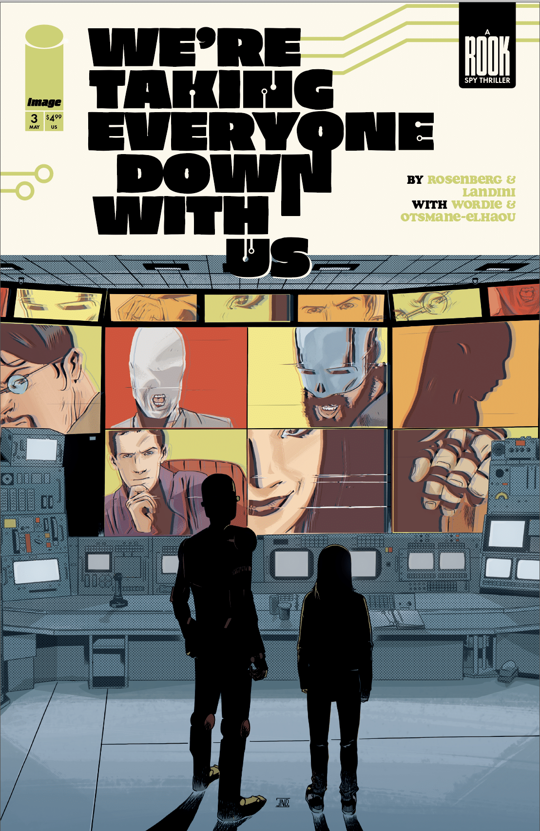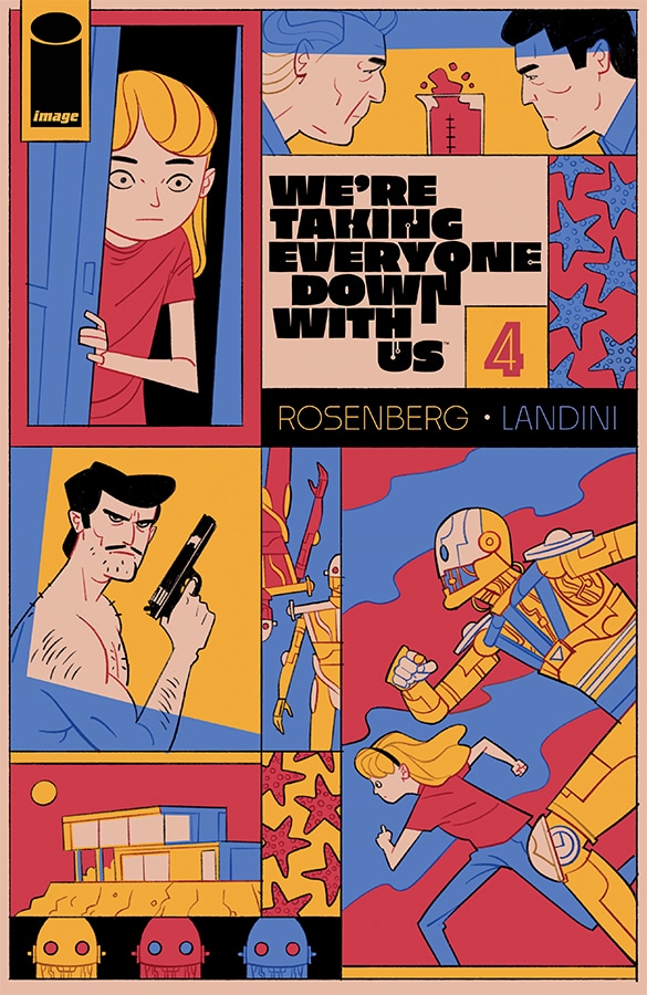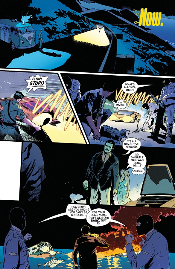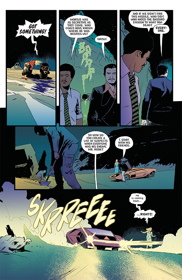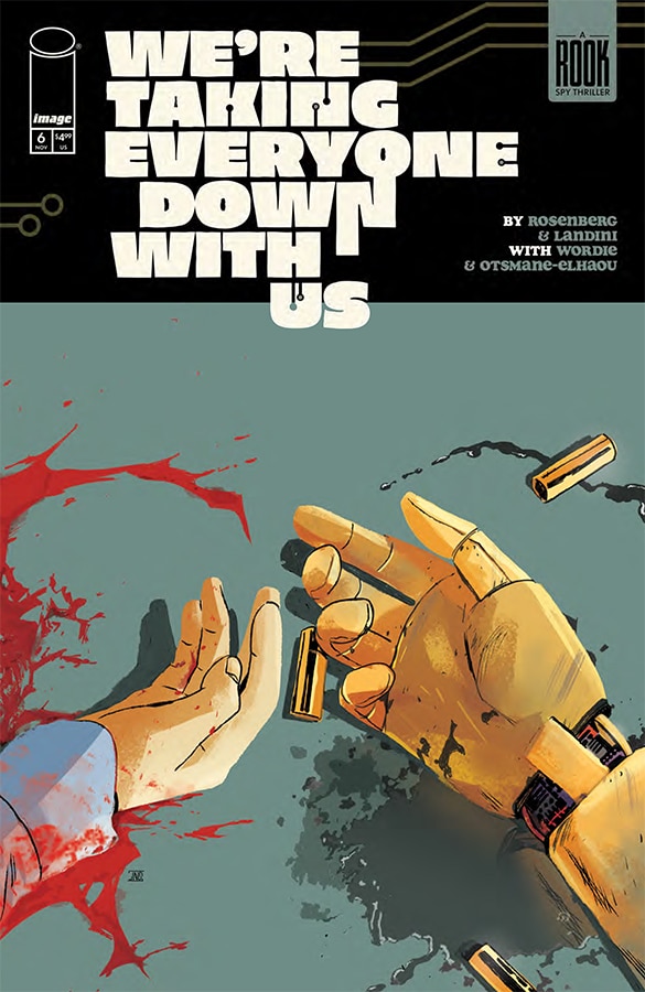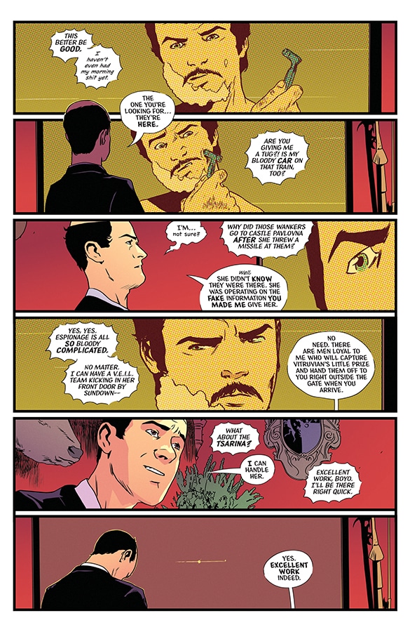 The art by Stefano Landini is great. With color by Jason Wordie and lettering by Hassan Otsmane-Elhaou, the comic relies on visual site gags as much as anything else. A character is revealed to be wearing less than an ideal amount of clothes at odd times, the looks they give each other while on a video chat, there’s so much in the art that builds off of and enhances Rosenberg’s script. It’s visuals feel like they come from the world of Zucker movies like Airplane and The Naked Gun as much as they do James Bond films.