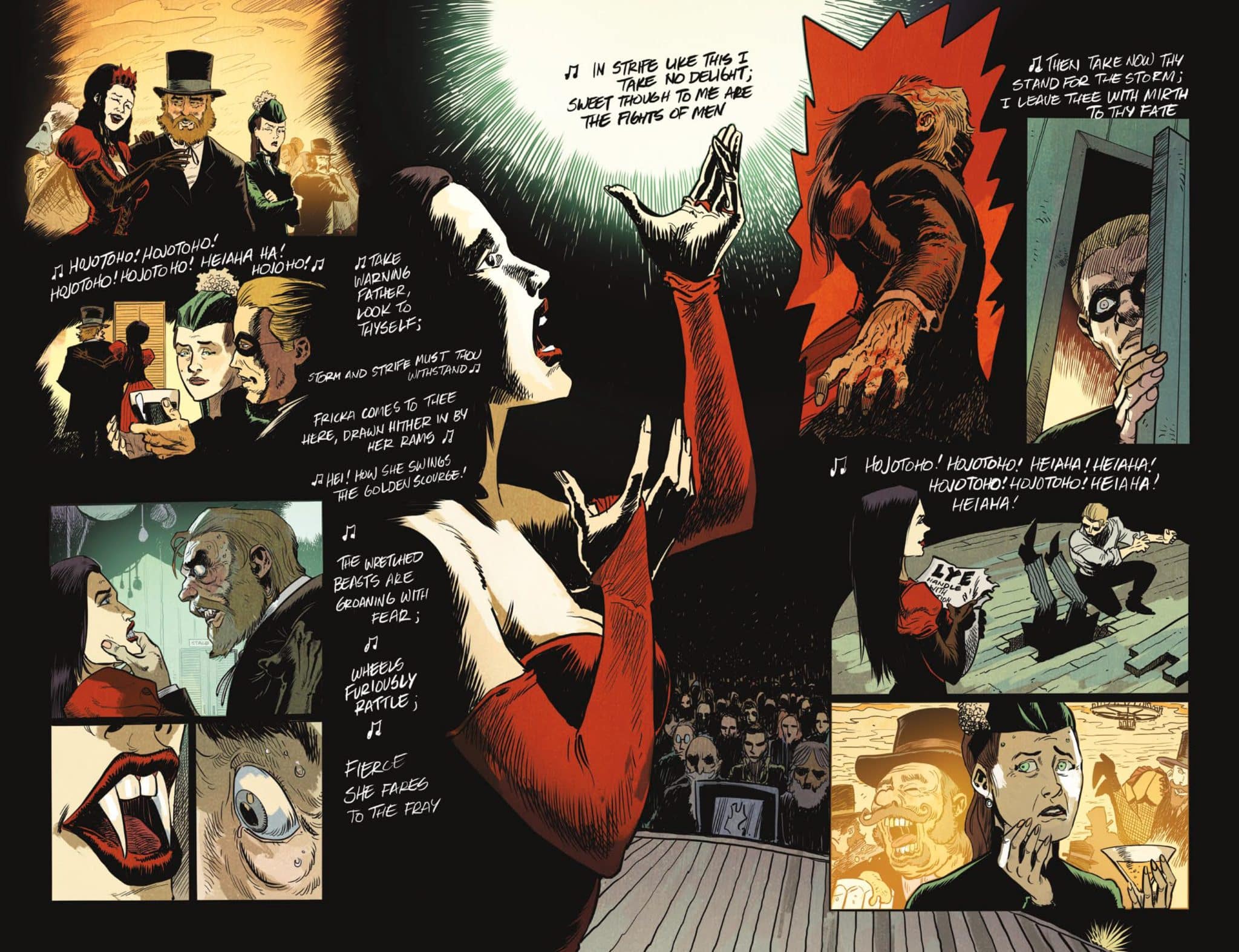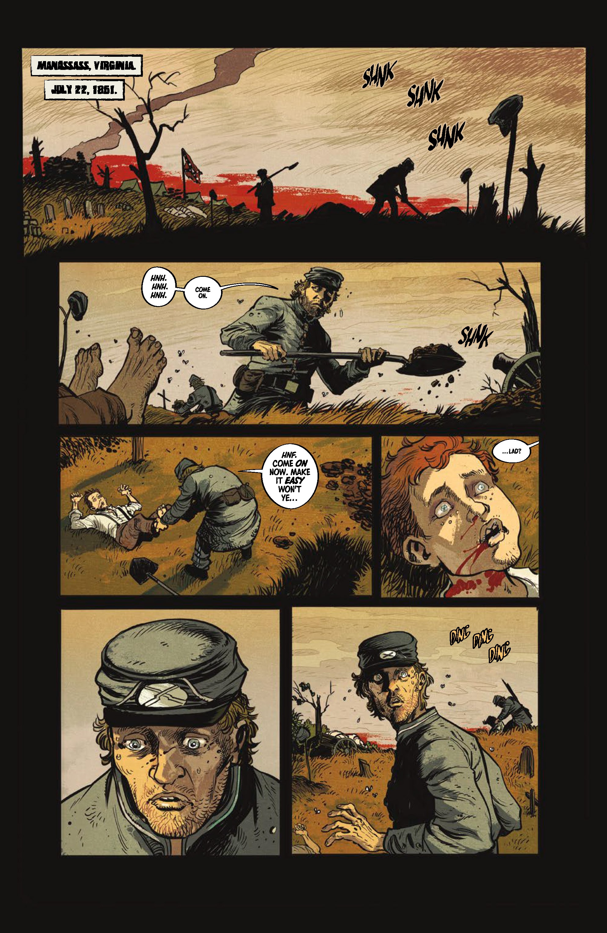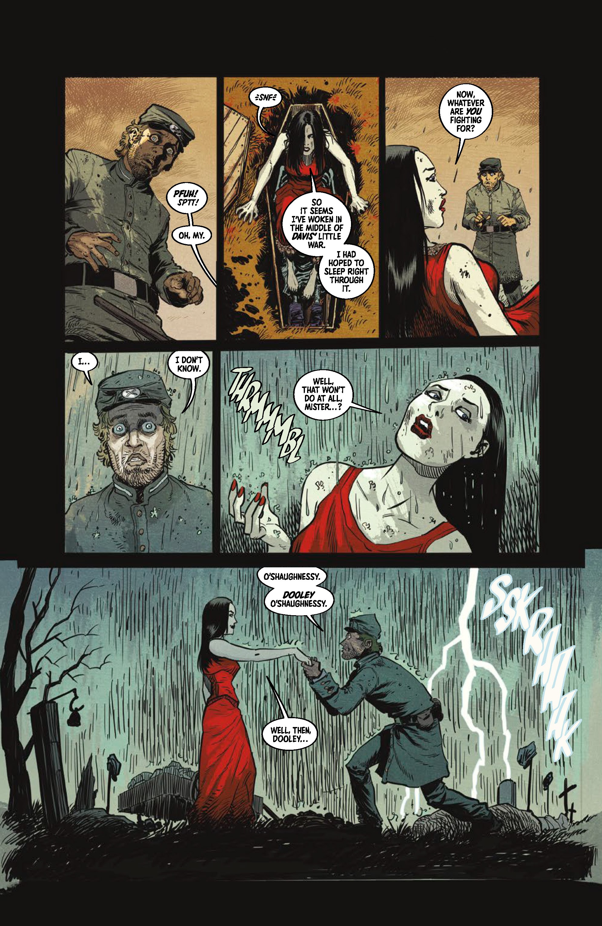 West of Sundown is co-written by Tim Seeley and Aaron Campbell, drawn by Jim Terry, colored by Triona Farrell and lettered by Crank!. West of Sundown is a western tale of survival starring a cast of literary horrors that center around a beautiful vampire must flee monster slayers in New York City and reclaim the ancestral soil that restores her undead flesh. But the world has changed since she was reborn in the New Mexico desert, and now Constance der Abend and her loyal assistant Dooley must adapt to life in the rough frontier town of Sangre de Moro, where all sorts of monsters have settled.