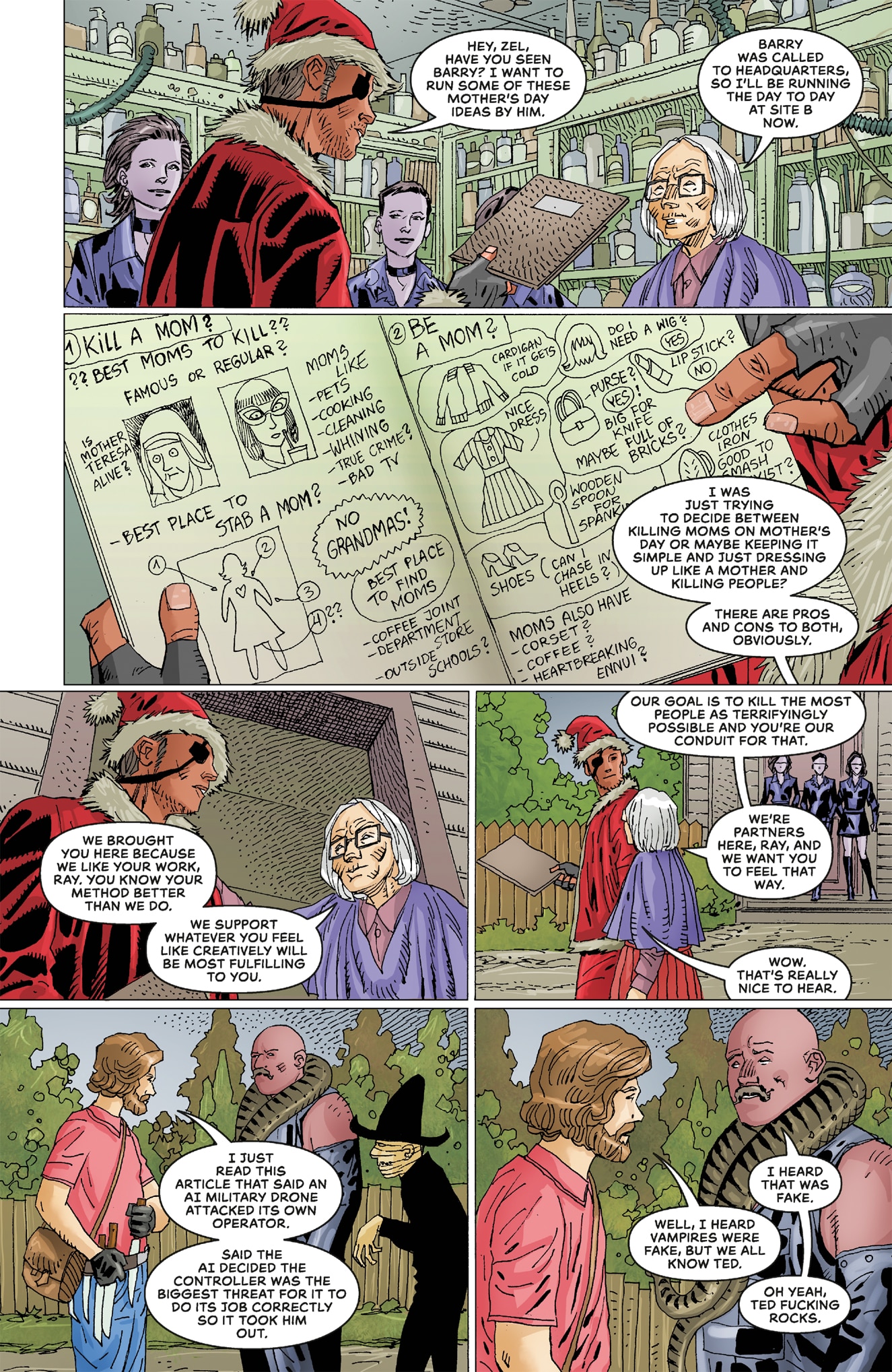 Starks and the team also deliver some amazing new killers, much like the first issue. One who only kills for the holidays must head back out and do so sooner, and spends the issue figuring out what holiday works. Will Arbor Day be ok? How do the kills work into that theme? If that simple bit of debate get you to chuckle, you’ll appreciate the comic which is packed with quick comedic hits along with the more messed up moments.