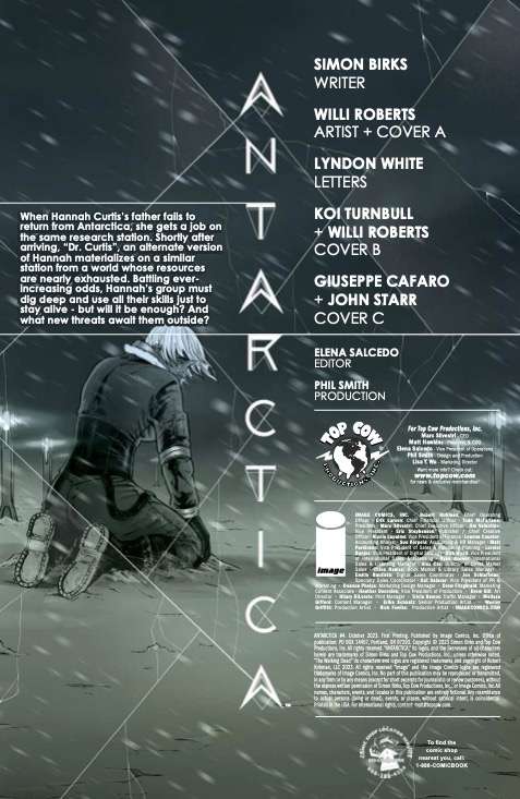The art by Willi Roberts is good. With lettering by Lyndon White, there’s a nice emotional ride in the first 2/3 of the comic as we’re taken through Hannah’s rough journey.. When we eventually get to Antarctica, there’s a coldness not in the white snow, but in the blacks, greys, and reds of the location. It’s all decent art but nothing quite jumps out or really uses its locations to deliver a bit more to the journey.