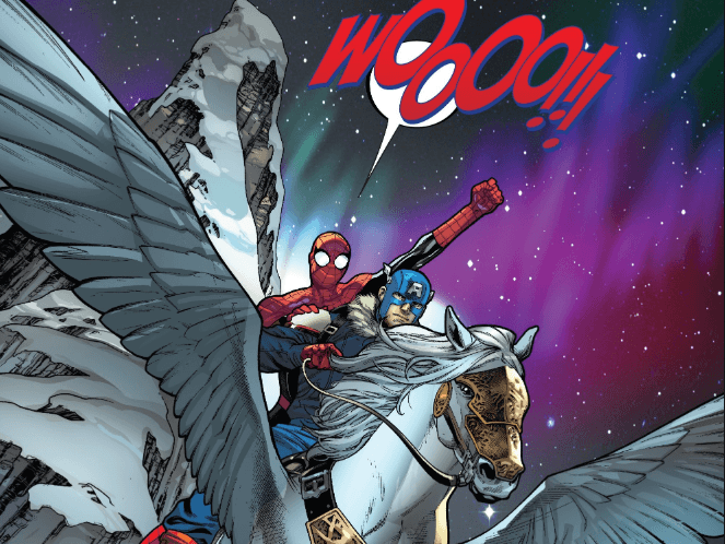 Tom Taylor, artists Jorge Molina and Adriano Di Benedetto and colorist David Curiel depict Captain America, Spider-Man, Wolverine, Luke Cage, and Iron Fist’s Pegasus-riding, Asgardian armor wearing quest to find Thor in War of the Realms Strike Force: Land of the Giants #1. Taylor makes Spider-Man the narrator and POV character as he processes all the violence, destruction, and fantasy beings around him in narrative captions that are him talking to Mary Jane. He is generally freaked out about what is going, but there is a feeling of real glee when Captain America swoops in on a flying horse to pick him up for a secret mission. The humor, both physical and verbal, is the secret ingredient in this comic from Wolverine messing with Spidey by putting a random helmet on his head to Luke Cage’s deadpan reaction to Spider-Man talking to his horse, Buttercup aka Queen Artorius.