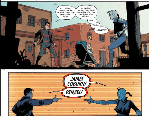 Journey into Mystery is the one “War of the Realms” tie-in that I’m glad is a five and not three issue miniseries. Who would have thought that a group of guys (The McElroys) who hang out on a regular basis would excel at writing an ensemble cast that you wouldn’t mind hanging out with? In this issue, the team goes Western and ends up at a literal ghost town populated by old Marvel Western characters. This prompts Death Locket and Wonder Man to debate about their favorite Westerns that culminates in finger guns at dawn. The sassy teen Death Locket’s love of classic Westerns (Nothing after 1970’s Rio Lobo.) is a weird trait, but the McElroys connect it to character background because those were the only movies she had access to as an LMD living with her “Uncle” Dum Dum. (Another LMD).
