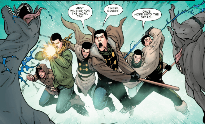 And the character of Queen Artorius is the real emotional linchpin of Land of the Giants #1 as Taylor and Molina show that the death of the Valkyries’ steeds in War of the Realms #3 wasn’t animal cruelty, but mighty warriors fighting to avenge their riders. Also, her description of Spider-Man as a “noble jester warrior” captures his essence. When the team hits Jotunheim, Molina, Di Benedetto, and Curiel’s become quite dark as they must kill all the Frost Giants for Thor to snap out of his berserker rage. This ability to blend a fun superhero ensemble piece with the horrors of war and genuine emotion is why Land of the Giants #1 gets an Overall Verdict of Buy.