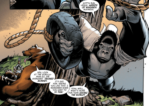 The choice of art team really impacts the story of Avengers #19. McGuinness, Morales, and Ponsor are known for their work on blockbuster comics and for the most part, play Gorilla Man’s entry into the War of Realms straight even if he and Russian double agent Ursa Major meet in a zoo to swap intel. Gorilla Man isn’t an Avenger, but his quick swinging and technical know-how allows Shuri and Tony to score a hit on the invading Frost Giant/Dark Elf army with a Celestial weapon. But, in keeping with the previous issue’s dark and shady tone, this isn’t the triumphant tale of a Z-list hero finding redemption, and Avengers #19’s subversive ending, characterization of Gorilla-Man, and big time art earns it an Overall Verdict of Buy. Aaron’s Avengers run is really the love child of Brian Michael Bendis’ sharp, savvy character interactions and Jonathan Hickman’s long term planning.
