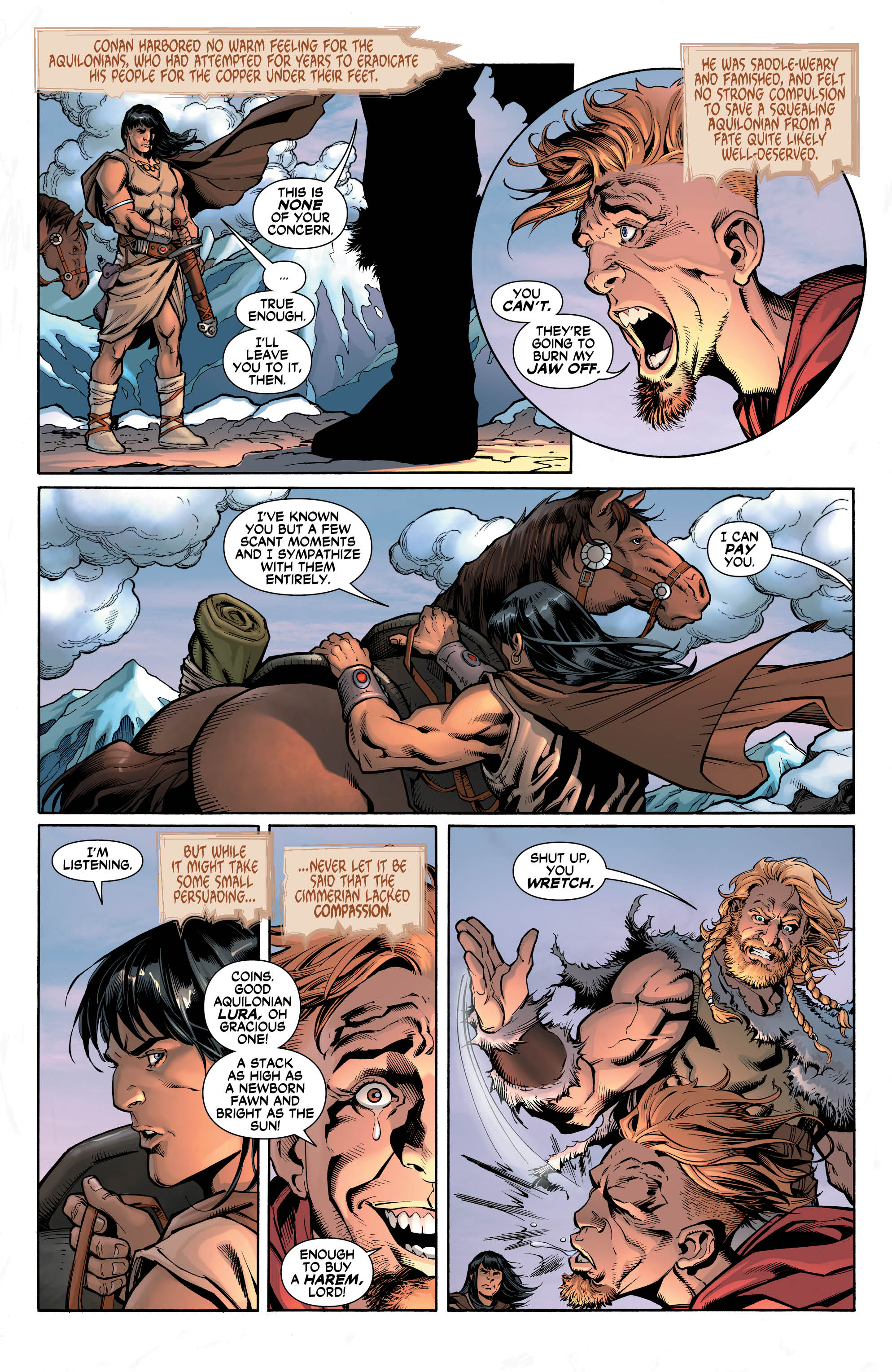 Lopresti gives Conan strength and a build similar to Diana and demonstrates this in a exhilarating beheading sequence when he kills an Aesir (Hyborian Age Viking expy) and blood trails from the severed neck in a sequence that Zack Snyder probably wishes he could direct. And this killing isn’t for honor or any of the virtues that Simone mentions her in Howard-esque caption boxes, but so he can have a purse of money to spend on prostitutes in Aquilonia, a city where he once was a slave in the fighting pits. Simone writes Conan as a bulky, violent merc while also humanizing him by creating a bond between him and a bullied street kid (Who he primes for information.) and in the adorable flashbacks where he falls in love with “Yanna”, a young Wonder Woman. Broome’s colors in these scenes are positively radiant, and Lopresti and Ryan’s figures are prettier and not as wracked by violence and caked in dirt. Also, the Amazons are a tribe in Robert E. Howard’s Hyborian Age mythos so the nomadic Cimmerians could have easily run into them, and Gail Simone also fits in Wonder Woman into Conan’s world without having to use any bullshit multiversal portals or time travel.