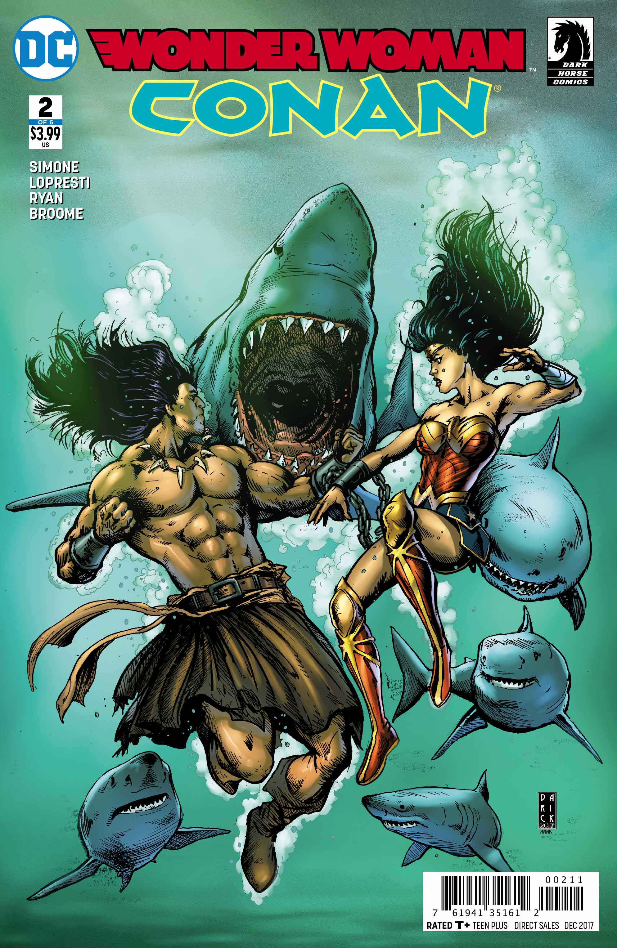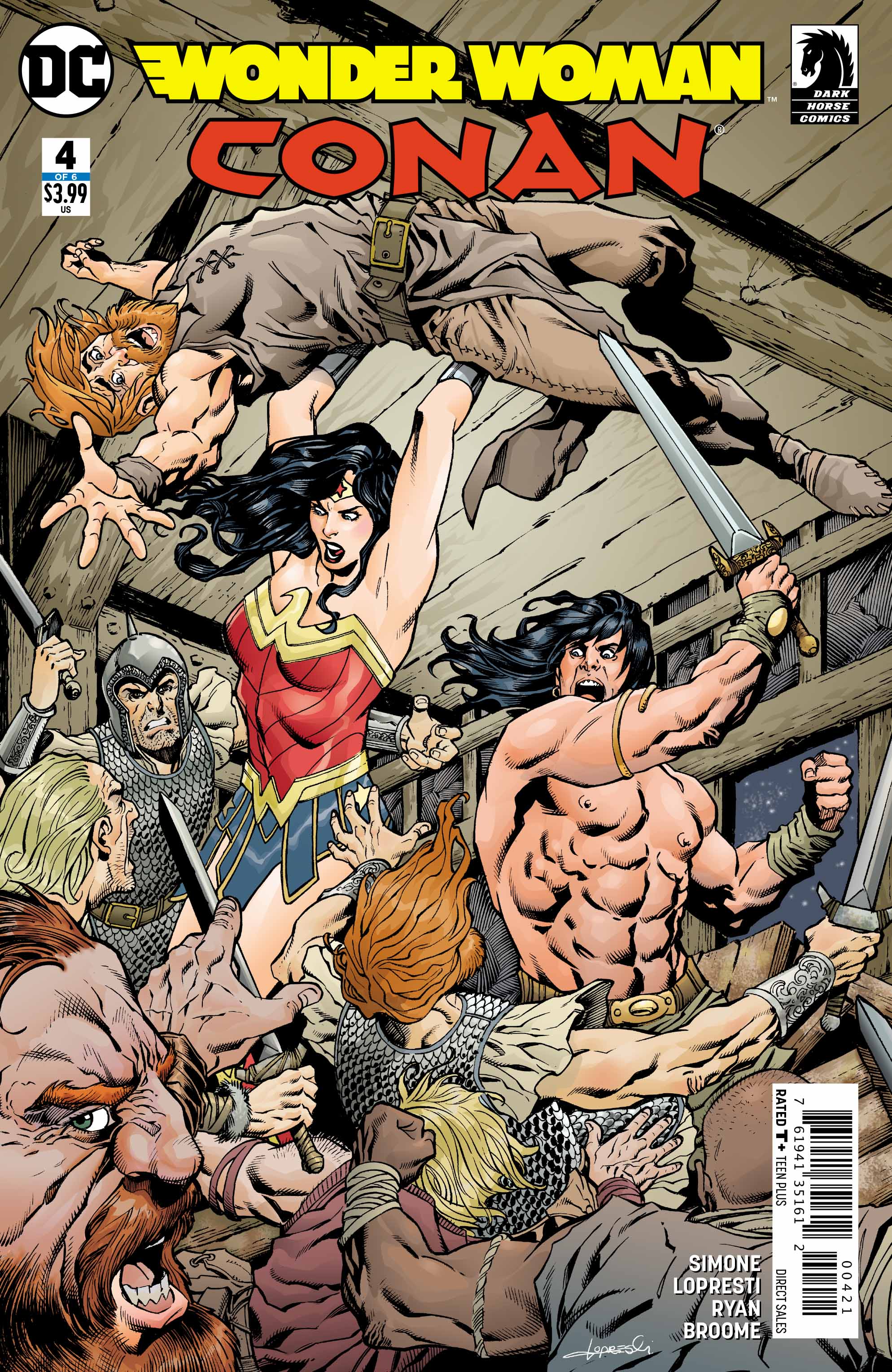 Wonder Woman/Conan #1 is not a superhero comic, and I love it for that. Writer Gail Simone, artists Aaron Lopresti and Matt Ryan, and colorist Wendy Broome dig deep into sword and sorcery (Well, mostly the sword part) and never look back and show that Diana of Themiscyra seamlessly fits into the Hyborian Age. Simone, Lopresti, and Ryan recast her as a champion pit fighter, who dominates the gladiators of Aquilonia with her familiar star and “W” emblem smeared in blood and mud instead of her classic costume as part of Broome’s dour, drab color palette. Conan is immediately drawn to her even though he was hanging out with a man, who bet a large sum of money against her, and he and Diana are set up as a star crossed pair from the first page.
