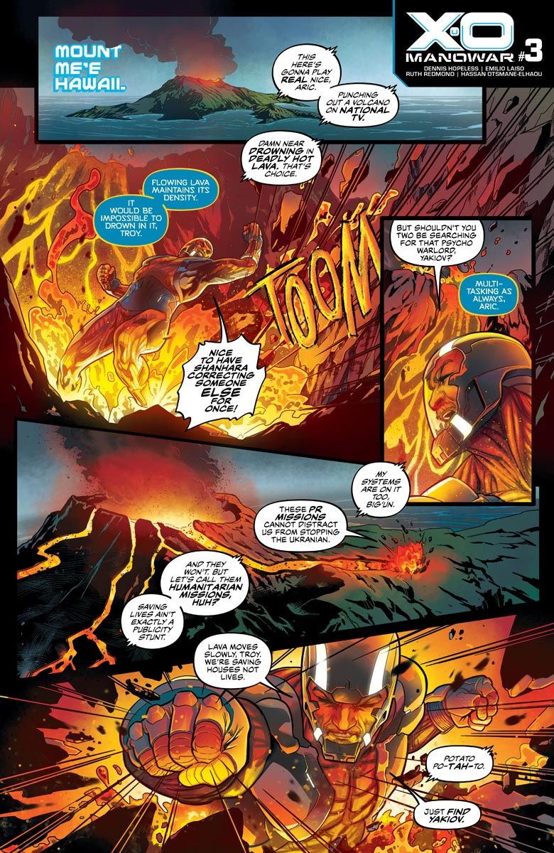 Who wins in a fight: X-O Manowar or a cybernetic tech monster formed out of lava? In order to prevent catastrophe, will Aric hand over the X-O armor to a new ally? Find out in X-O Manowar #3!