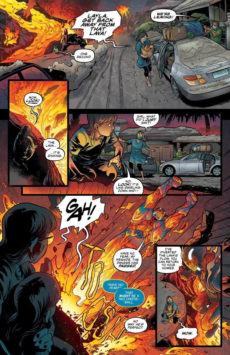 Emilio Laiso‘s art combined with Ruth Redmond‘s colouring is still a high point in the comic, and at least provides something interesting to look at when reading the at times dull comic. Redmond’s colours that elevate Laiso’s art consistently, and whether it’s the raging lava of a volcano or the more mundane breakfast table scene earlier in the comic (this was actually my favourite part of the comic, honestly – unfortunately it’s at the beginning, and it’s downhill from there).