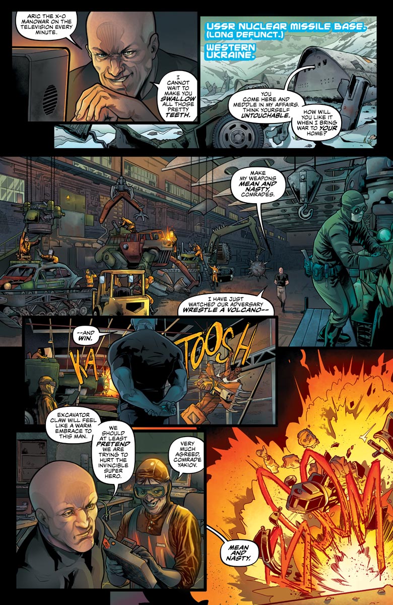 GP: X-O Manowar has Aric being manipulated to step into a civil war in Ukraine. While not exactly what’s going on it has echoes of the reality in Crimea and the nationalist forces at play. Often in comics, you see made-up countries for conflicts but here you’re willing to reference a real-life conflict (though with a bit of a twist on what’s exactly going on). Did you think about using a “fake” country at all? Any thoughts on how it might be taken by certain parties at play there? Part of the conflict is driven by white nationalists, is that going to be touched upon?