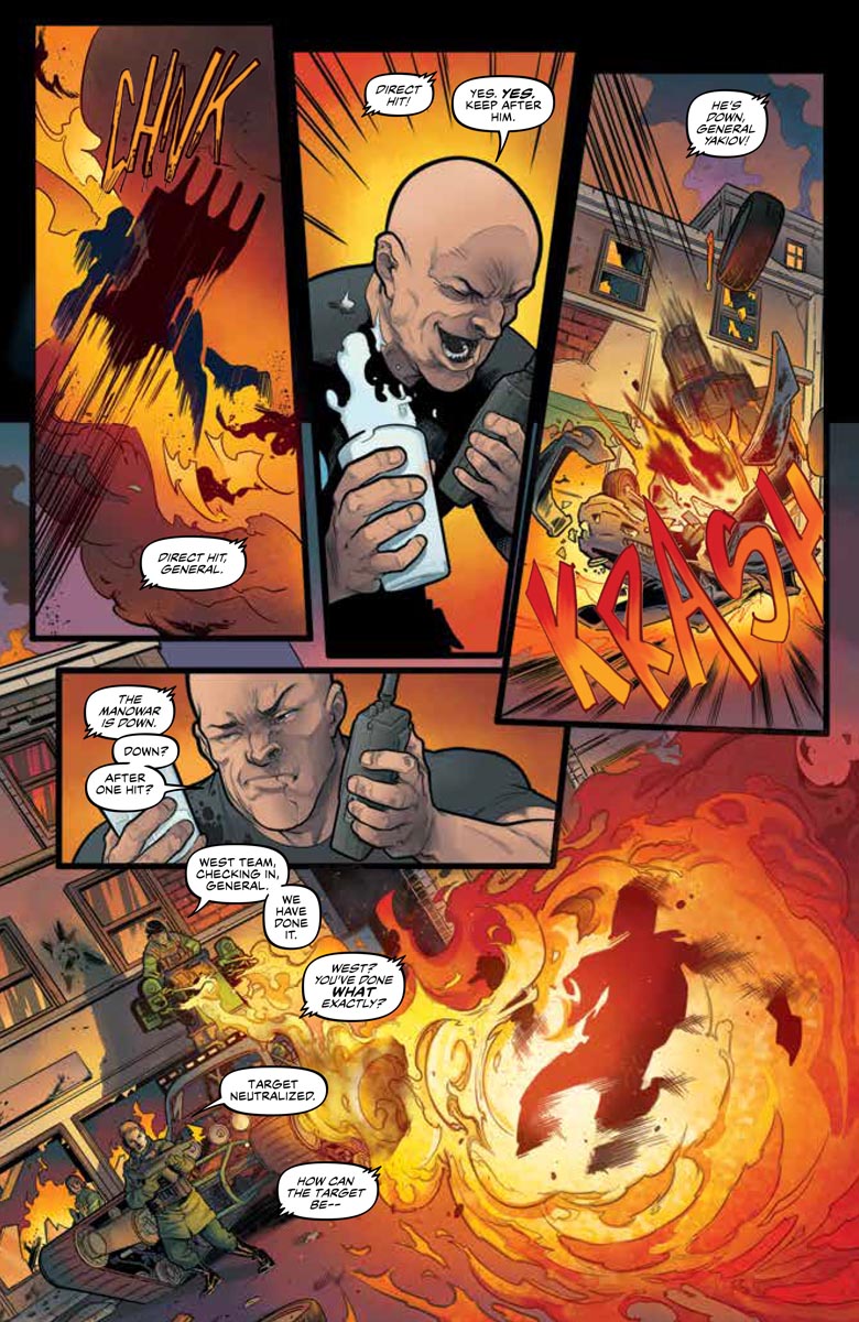 DH: That’s absolutely the point. When the eyes of the world never close and everyone has an opinion, super heroism becomes a lot trickier. There are real-world ramifications to crashing a helicopter through a building…No matter how evil the helicopter might be. End a war with a punch. Throw a dictator into the ocean. That’s all great, but what happens next? When you power up vigilantism to X-O Manowar levels, there’s no limit to the good he can affect. But rapid change can be very dangerous and is often very unpopular.