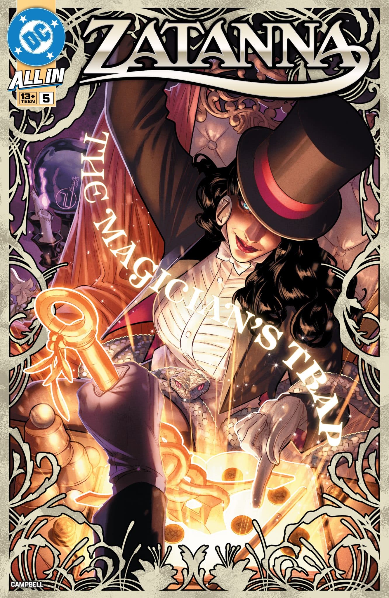 Zatanna is definitely a comic where the art is better than the writing as it ends with a cliched cliffhanger, and it goes a little too mysterious for the first issue of a new series. (I do have faith that we’ll learn more about Lady White in future issues so I won’t ding the title too hard for that.) However, despite the hypercompression of Campbell’s plotting, he does execute a magnificent tour de force of Zatanna’s abilities, both as stage magician and an occult superhero using similar splash pages and intricate layouts for her show as well as magical battles against ghostly, mysterious Hollywood stars. However, there is still time for vulnerability like when Zatanna is brooding in her dressing room in her first appearance before putting on a brave face for rehearsal. Also, not every trick goes off without a hitch, but this imperfection adds much-needed conflict to the comic and breaks the montage of gorgeous spreads