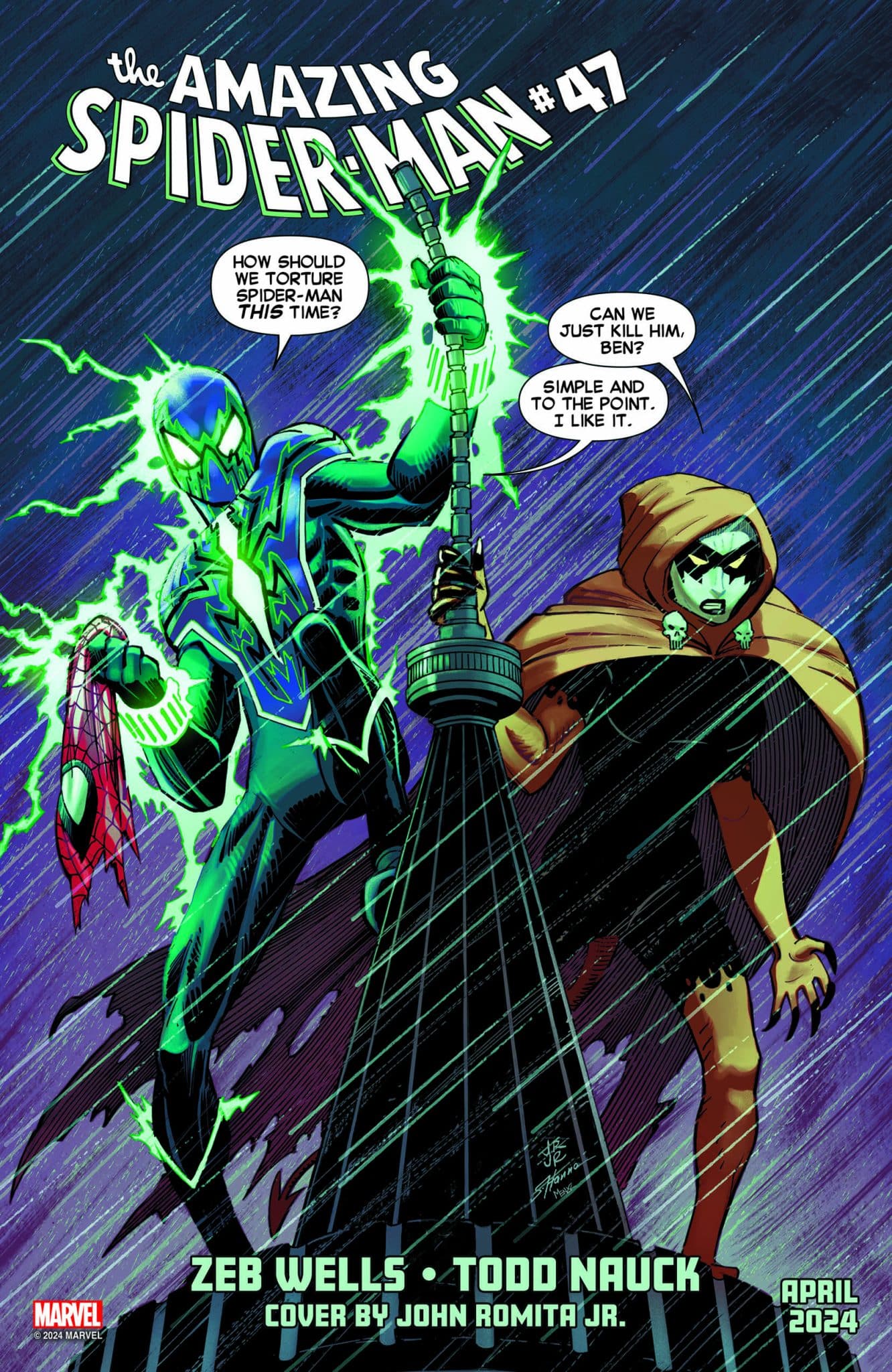 Coming April 11, check out the cover to Amazing Spider-Man #47 by John Romita Jr., written by Zeb Wells, and interior art by Todd Nauck.
